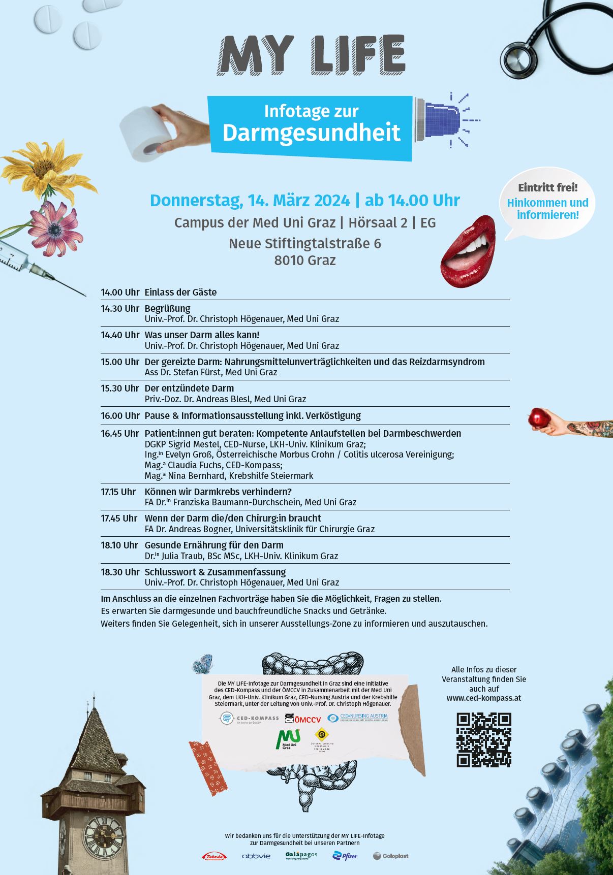 Wann: 14. März 2024 ab 14.00 bis 18.30 Uhr Wo: Campus der Med Uni Graz | Hörsaal 2 | EG | Neue Stiftingtalstraße 6 | 8010 Graz Die MY LIFE-Infotage zur Darmgesundheit werden im Zeitraum Mai 2023 bis Juni 2024 an insgesamt sechs Standorten in ganz Österreich durchgeführt. Im Rahmen der MY LIFE-Infotage zur Darmgesundheit in Graz erwarten dich von 14.30 bis 18.30 Uhr medizinische Fachvorträge mit aktuellen Informationen rund um die häufigsten Erkrankungen im gesamten Verdauungstrakt – von Nahrungsmittelunverträglichkeiten über Reizdarm bis zu Chronisch Entzündlichen Darmerkrankungen. Die MY LIFE-Infotage zur Darmgesundheit in Graz sind eine Initiative des CED-Kompass und der ÖMCCV in Zusammenarbeit mit der Med Uni Graz, dem LHK-Univ. Klinikum Graz, CED-Nursing Austria und der Krebshilfe Steiermark, unter der Leitung von Univ.-Prof. Dr. Christoph Högenauer. DER EINTRITT IST FREI! Hinweis: Die MY LIFE-Infotage zur Darmgesundheit werden im Zeitraum Mai 2023 bis Mai 2024 an insgesamt sechs Standorten in ganz Österreich durchgeführt. Alle Infos zur Event-Reihe findest du auch auf der Website des CED-Kompass unter www.ced-kompass.at.